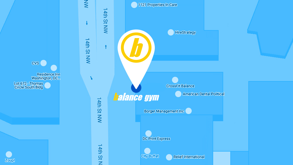 The Thomas Circle location spans two buildings – the Personal Training Studio at 1111 14th Street NW, Washington DC 20005, and the Main Gym at 1339 Green Court NW, Washington DC 20005 (just behind the Training Studio).